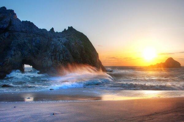 море волны скалы песок пляж небо закат2081 x 1200, 323 кБ