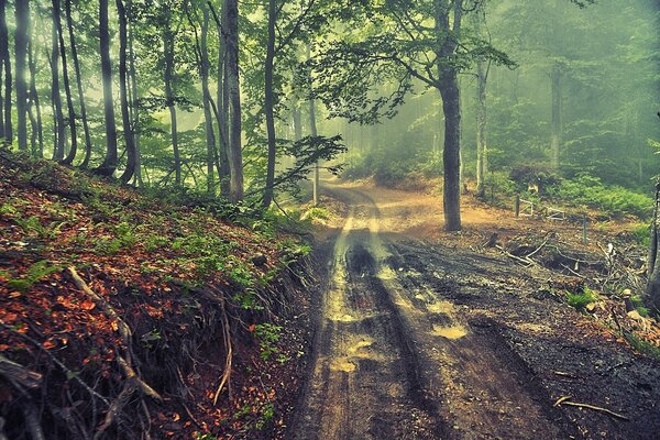 лес деревья дорога туман1920 x 1275, 1020 кБ