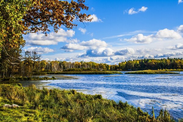 небо облака лес деревья осень листья река берег трава1920 x 1200, 798 кБ