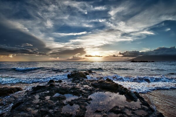 природа море река вода волна солнце закат лучи отражение небо облака фон обои широкоформатные полноэкранные широкоэкранные широкоформатный