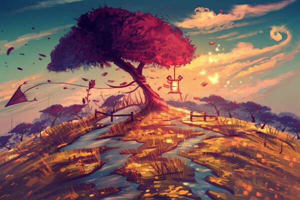 арт фантазия дерево бабочки река воздушный змей1974 x 1200, 448 кБ