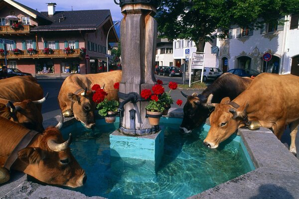 Водопой альпийских коров из фонтана1920 x 1080, 528 кБ