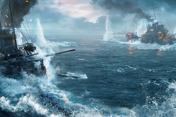 мир военные корабли wargaming нетто поражает мир кораблей рг выстрел пламя огонь облака дым вода небо корабли корабль волны торпеда сражения