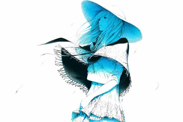 искусство sawasawa девушка ветер шляпа лепестки голубой минимализм1920 x 1200, 265 кБ