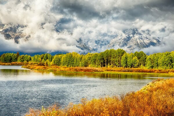 гранд тетон национальный парк вайоминг сша горы озеро река отражение деревья ель небо дом осень hdr1920 x 1279, 728 кБ