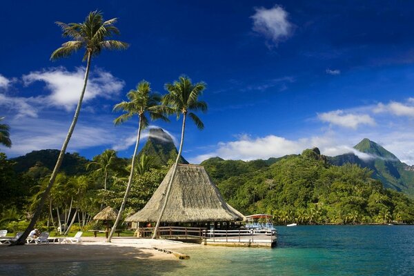 Домик из соломы в райском уголкена берегу моря с пальмами1680 x 1050, 347 кБ