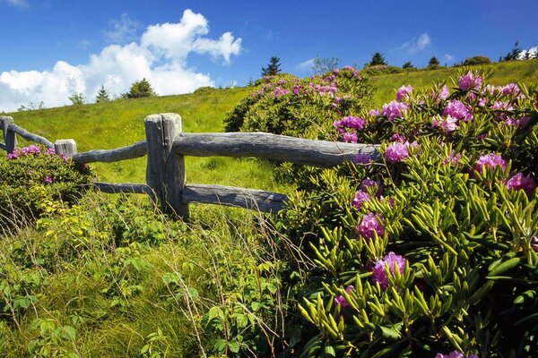 лето небо зеленая поляна изгородь цветы.1920 x 1200, 608 кБ
