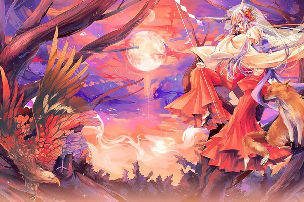 аниме девушка лисичка кицунэ лиса зверюшки птица луна2344 x 1191, 776 кБ
