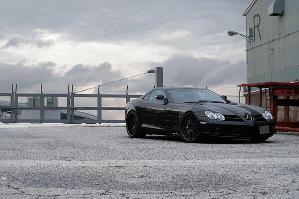 mercedes benz slr mclaren черный мерседес бенц макларен вид спереди ограждение колючая проволока1920 x 1285, 558 кБ