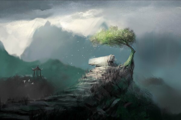 горы дерево кривое скалы беседка арт