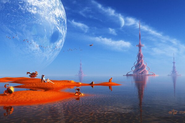 рендер пейзаж фантастический мир башни девушка транспорт песок существа птицы планета вода1920 x 1080, 283 кБ