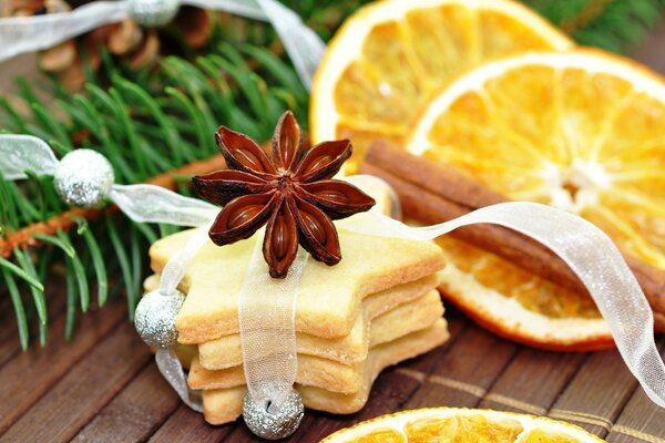 Красиво оформленные печенья на фоне апельсинов и веток ели1920 x 1200, 327 кБ