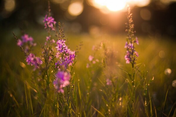 природа поляна цветы вечер лето солнце закат свет лучи блики травы растения фон обои1920 x 1200, 216 кБ