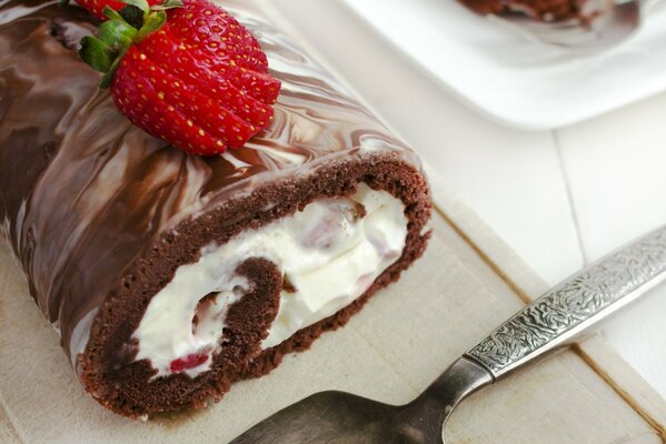 десерт кофе шоколад клубника крем ломтики листья сладости рулет кофейный шоколадный клубничный мята