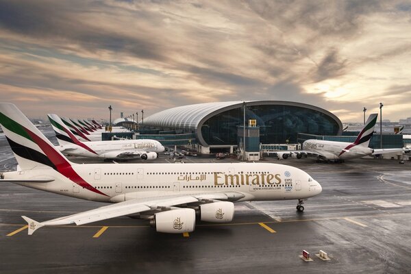 авиакомпания emirates аэробус а380 авиалайнер самолет пассажирский аэропорт дубай оаэ здание терминал восход небо облака пассажира2213 x 1200, 387 кБ