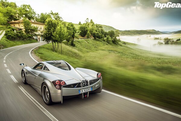 top gear топ гир высшая передача самая лучшая телепередача pagani huayra пагани уайра суперкар вид сзади дорога деревья дом фон1920 x 1200, 393 кБ