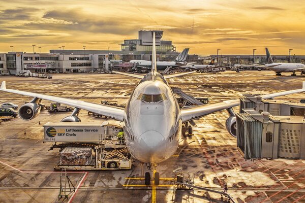 германия франкфурт самолет lufthansa закат hdr
