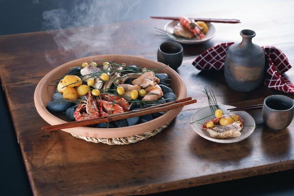 Китайское блюдо с креветками сервировано с палочками и чашами1920 x 1080, 285 кБ
