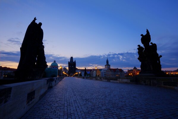 чехия прага столица город карлов мост вечер сумерки закат небо облака синева архитектура подсветка дома здания огни фонари1920 x 1283, 269 кБ