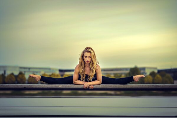 блондинка взгляд гимнастика растяжка гибкость шпагат перила фон небо2000 x 1125, 248 кБ
