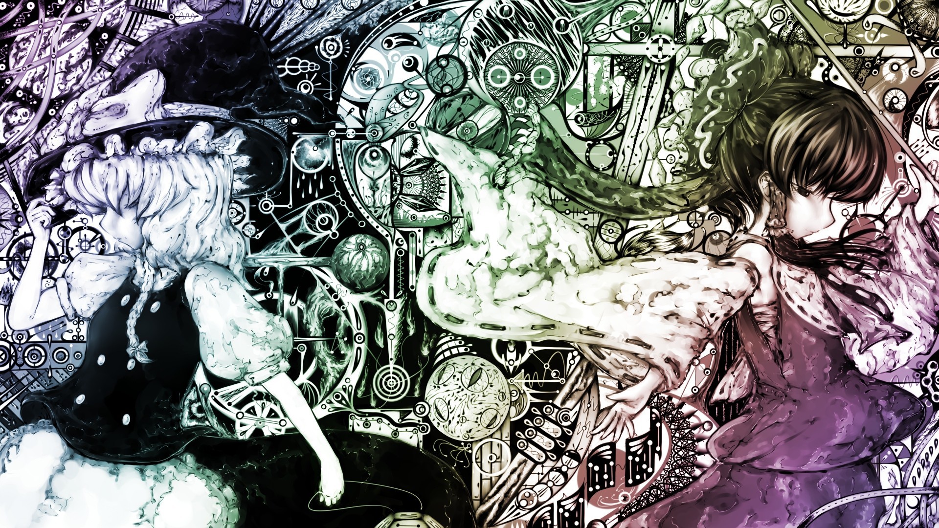 голубые глаза оранжевые глаза светлые волосы вампир черные волосы длинные волосы 2girls японская одежда клык алукард зонтик1920 x 1368, 659 кБ