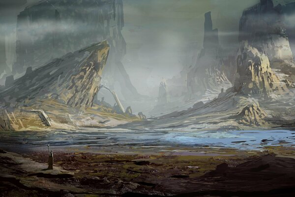 арт cloudminedesign фантастика скалы человек посох долина2000 x 1200, 317 кБ