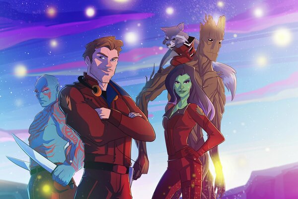 искусство мхк девушка гамора парни дракс разрушитель гроот петр quill ракета енот улыбка смущение объятья оружие стражи галактики 2010 x 1200, 426 кБ