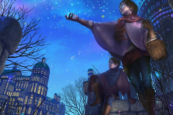 арт reishin девушка парень ночь дома небо звезды шарф корзинка1920 x 1483, 562 кБ