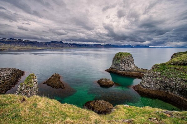 snaefellsnes исландия небо облака озеро природа камни трава