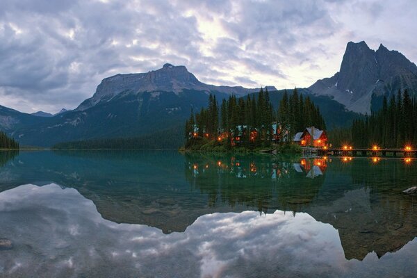 канада йохо национальный парк озеро изумрудное горы дома огни отражение утро рассвет1920 x 1080, 329 кБ